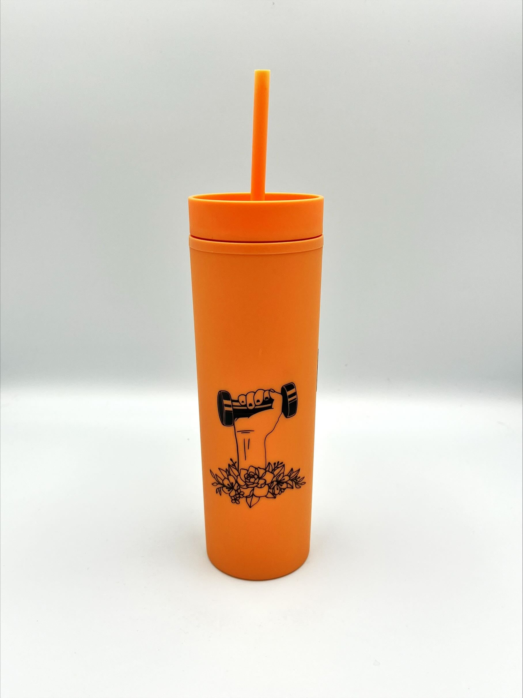 Tall cold cup, 16 oz with a matt finish and matching lid and straw.