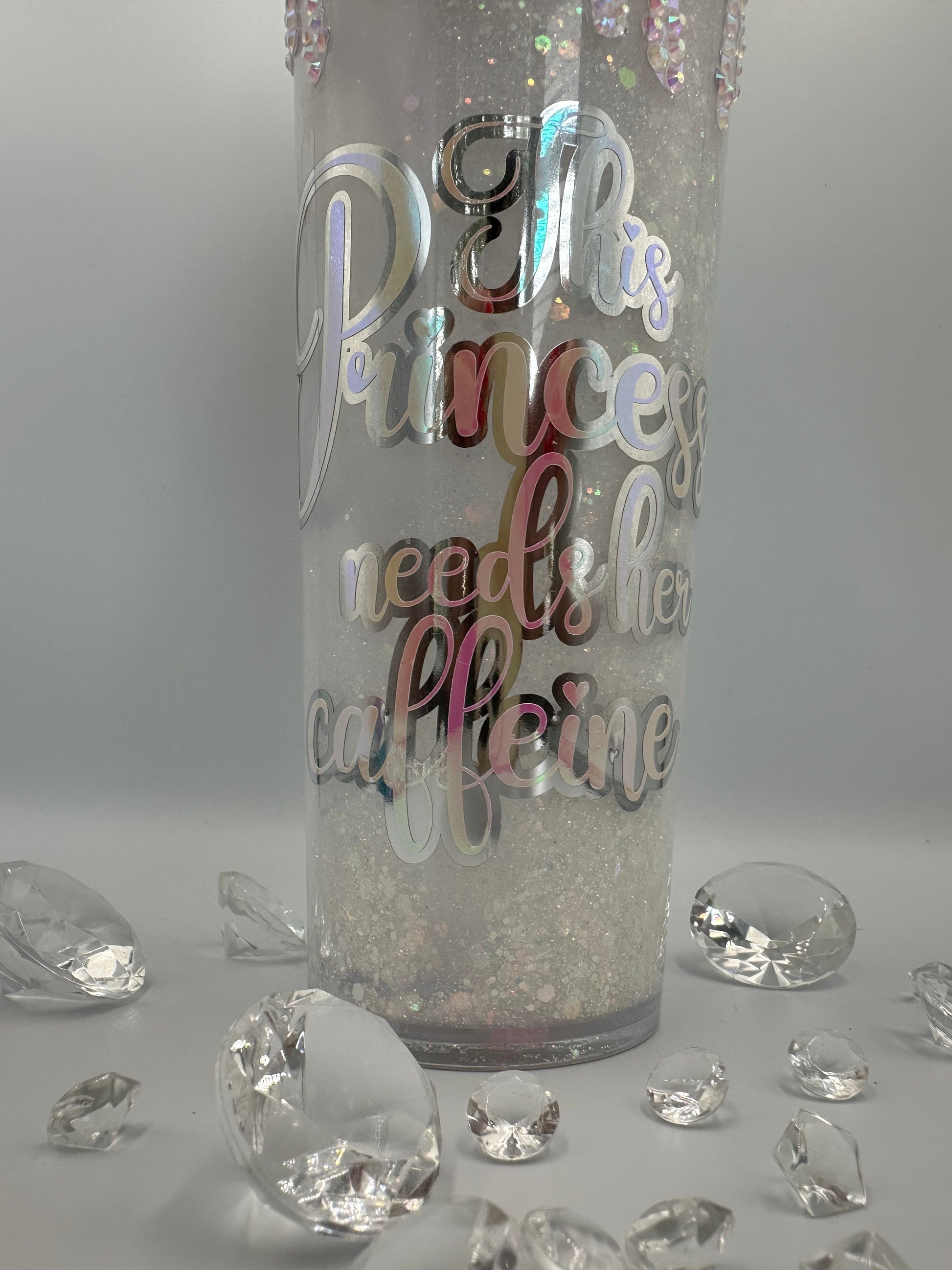 The lid of the tumbler is covered in rhinestones and a crown - choose gold or silver crown from the option menu.